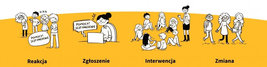 Część interwencyjna obejmuje aplikację mobilną, w której uczniowie mogą zgłaszać niepokojące ich sytuacje oraz panel interwenta, w którym wyznaczone osoby z grona pedagogicznego będą korespondowały z uczniami i na bieżąco reagowały na nadesłane zgłoszenia.