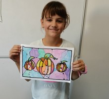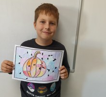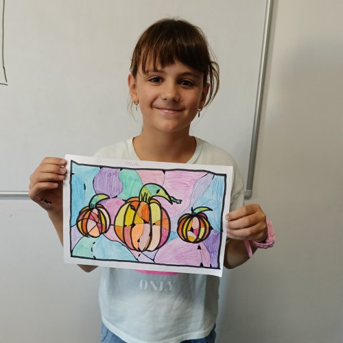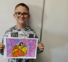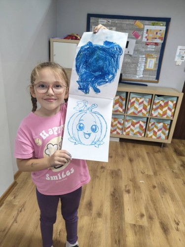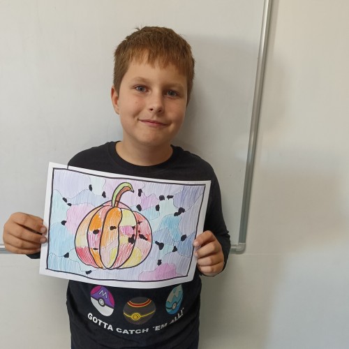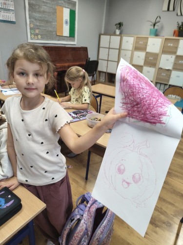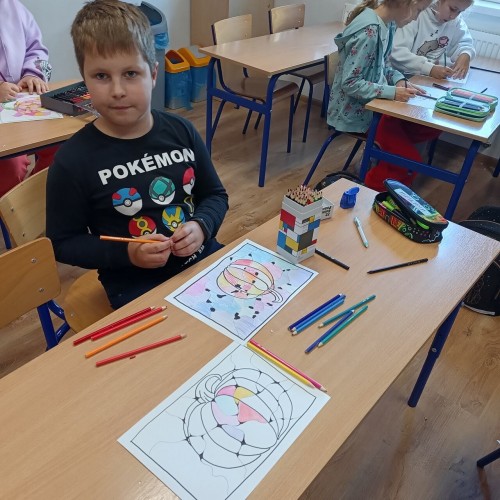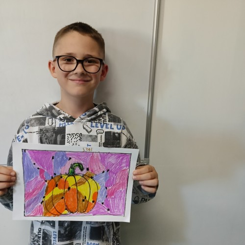 Z kolei trzecioklasiści skupili się na tematyce jesiennej. Nauczyli się, jak w prosty sposób narysować dynię, a następnie pokolorowali swoje prace w sposób abstrakcyjny, eksperymentując z barwami i kształtami. Ich kompozycje zachwycały oryginalnością i pomysłowością!
