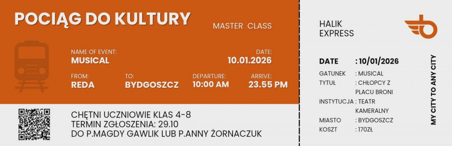Serdecznie zapraszamy wszystkich chętnych uczniów do udziału w proponowanych wydarzeniach kulturalnych – wsiadajcie z nami do „Pociągu do Kultury”!