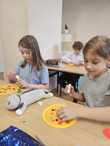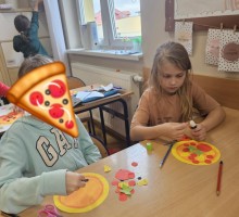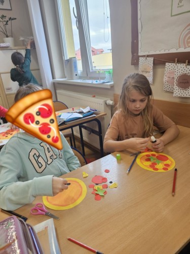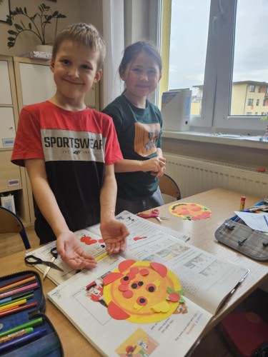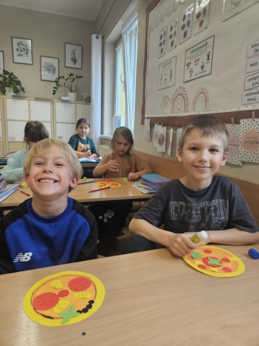 Dziś uczniowie klasy 2b połączyli naukę języka angielskiego z kreatywną zabawą! Podczas zajęć plastyczno-językowych stworzyli własne prace przedstawiające ulubione pizze, a jednocześnie utrwalali słownictwo i zwroty związane z ich zamawianiem po angielsku.
