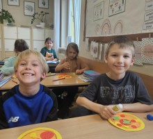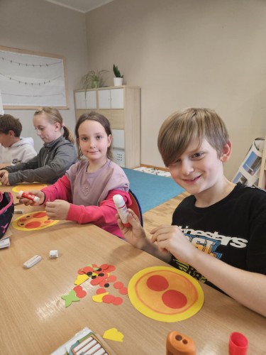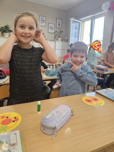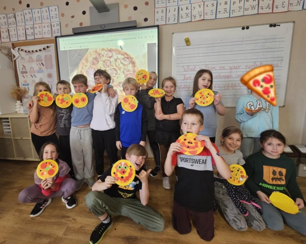 Każdy uczeń mógł zaprojektować swoją „idealną pizzę” – z ulubionymi składnikami, kolorowym tłem i angielskimi podpisami. W ten sposób nauka nowych słów stała się przyjemnością – pepperoni, cheese, mushrooms czy olives nie miały już przed nimi tajemnic!