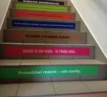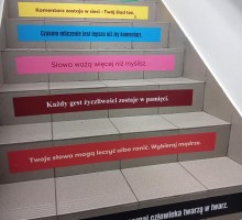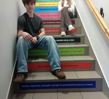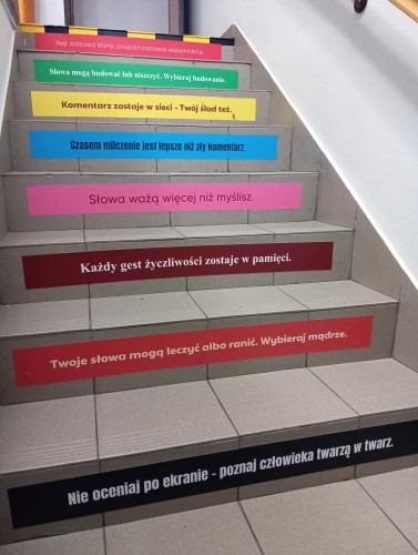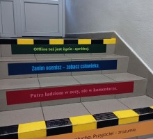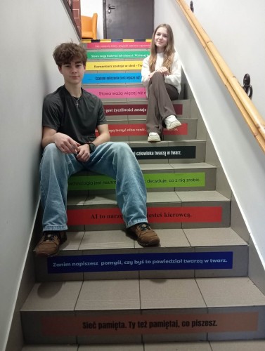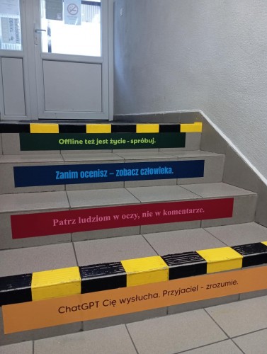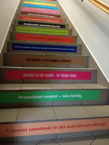 …na schodach w naszej szkole pojawiły się hasła zwracające uwagę na ważne problemy współczesnego świata cyfrowego, takie jak uzależnienie od internetu, bezrefleksyjne korzystanie z narzędzi AI oraz hejt w sieci. Krótkie, ale mocne komunikaty mają skłaniać uczniów do zatrzymania się na chwilę, refleksji i świadomego podejścia do technologii, z której korzystamy na co dzień.
