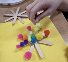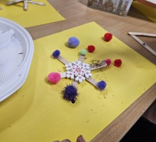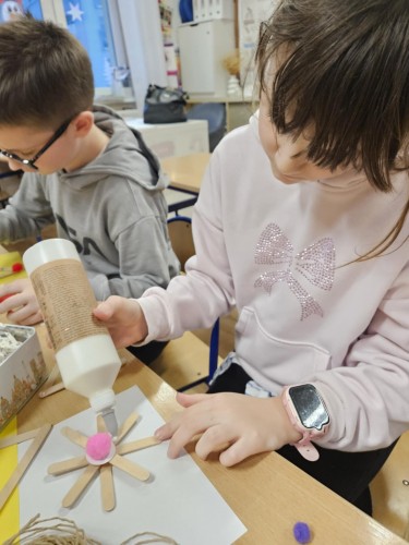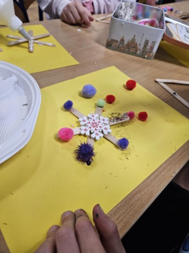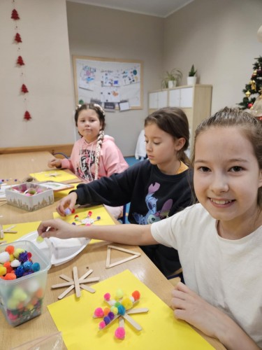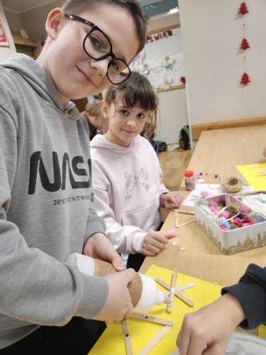 Podczas zajęć uczniowie wykorzystywali różnorodne materiały – papier, bibułę, tekturę, naturalne dodatki oraz elementy recyklingowe. Dzięki temu dzieci nie tylko rozwijały swoje zdolności manualne i artystyczne, ale także uczyły się cierpliwości, dokładności i współpracy w grupie. Wspólne tworzenie było doskonałą okazją do rozmów o tradycjach bożonarodzeniowych, symbolice świątecznych dekoracji oraz znaczeniu wzajemnej życzliwości.
