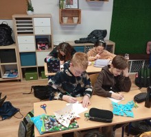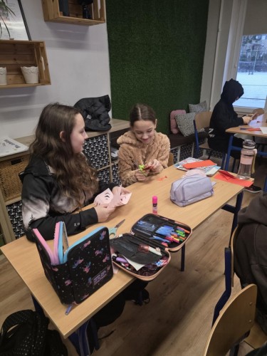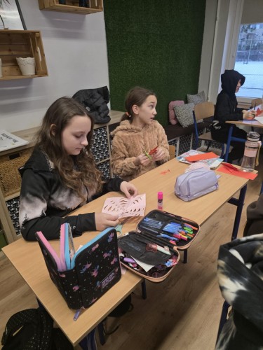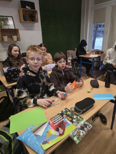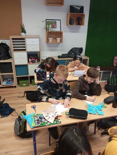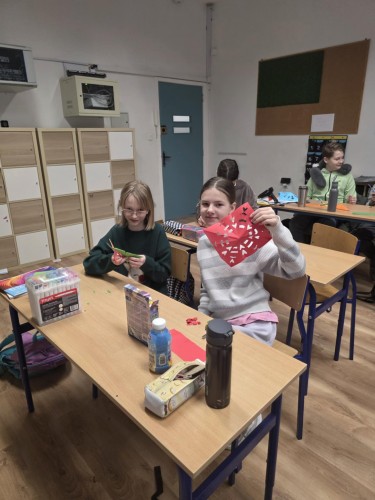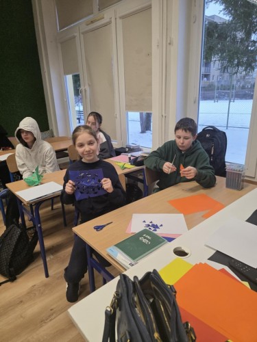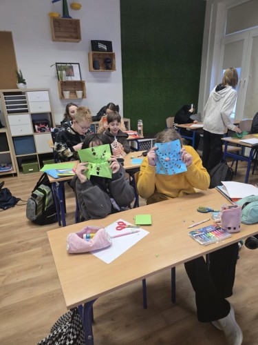 Uczniowie klasy 5 podczas jednej z lekcji geografii poznawali grupy etniczne zamieszkujące pas Nizin Środkowopolskich. W ramach zajęć połączyli wiedzę o regionach z elementami sztuki ludowej, tworząc własne wycinanki inspirowane tradycją łowicką i kurpiowską.